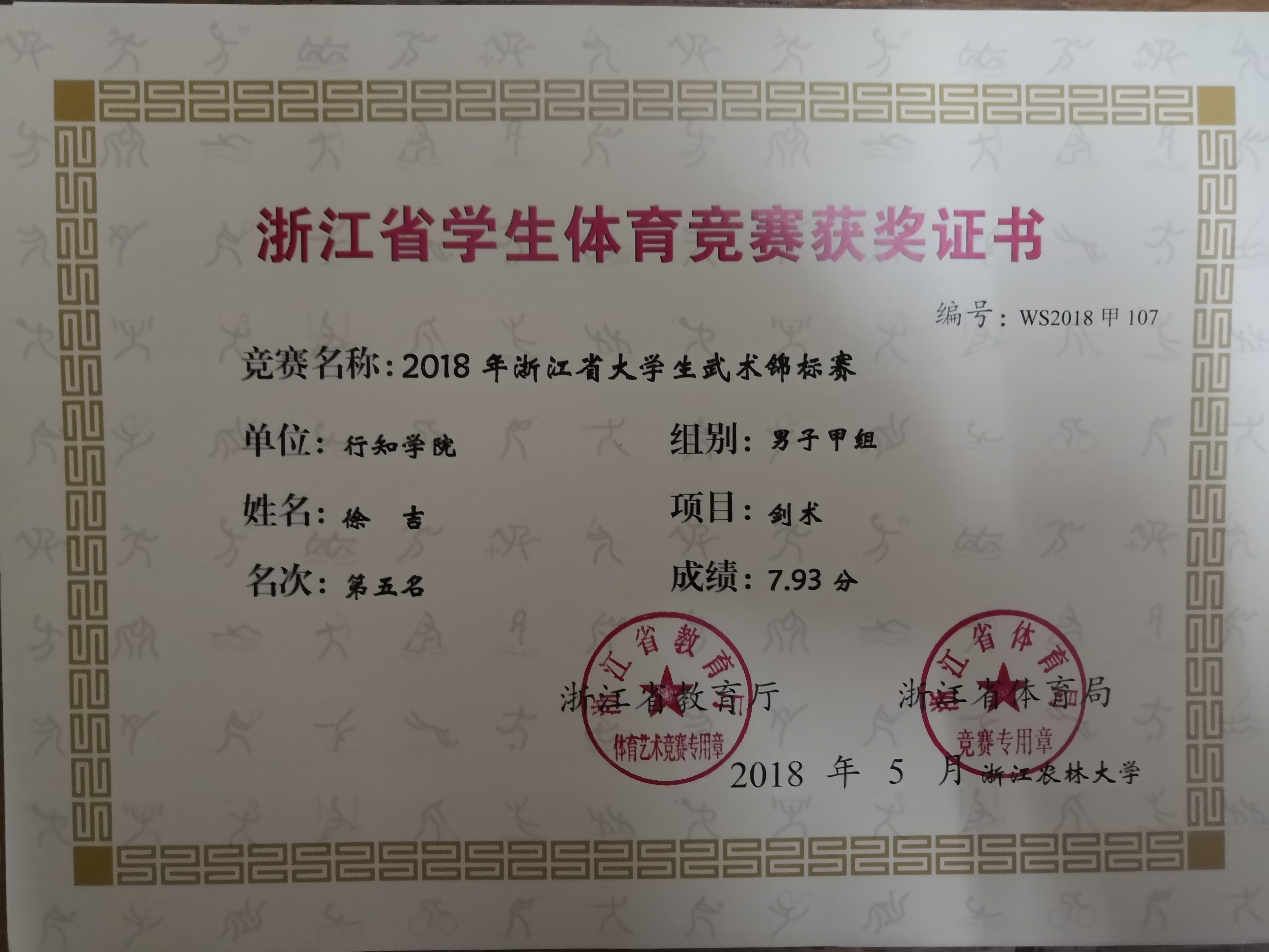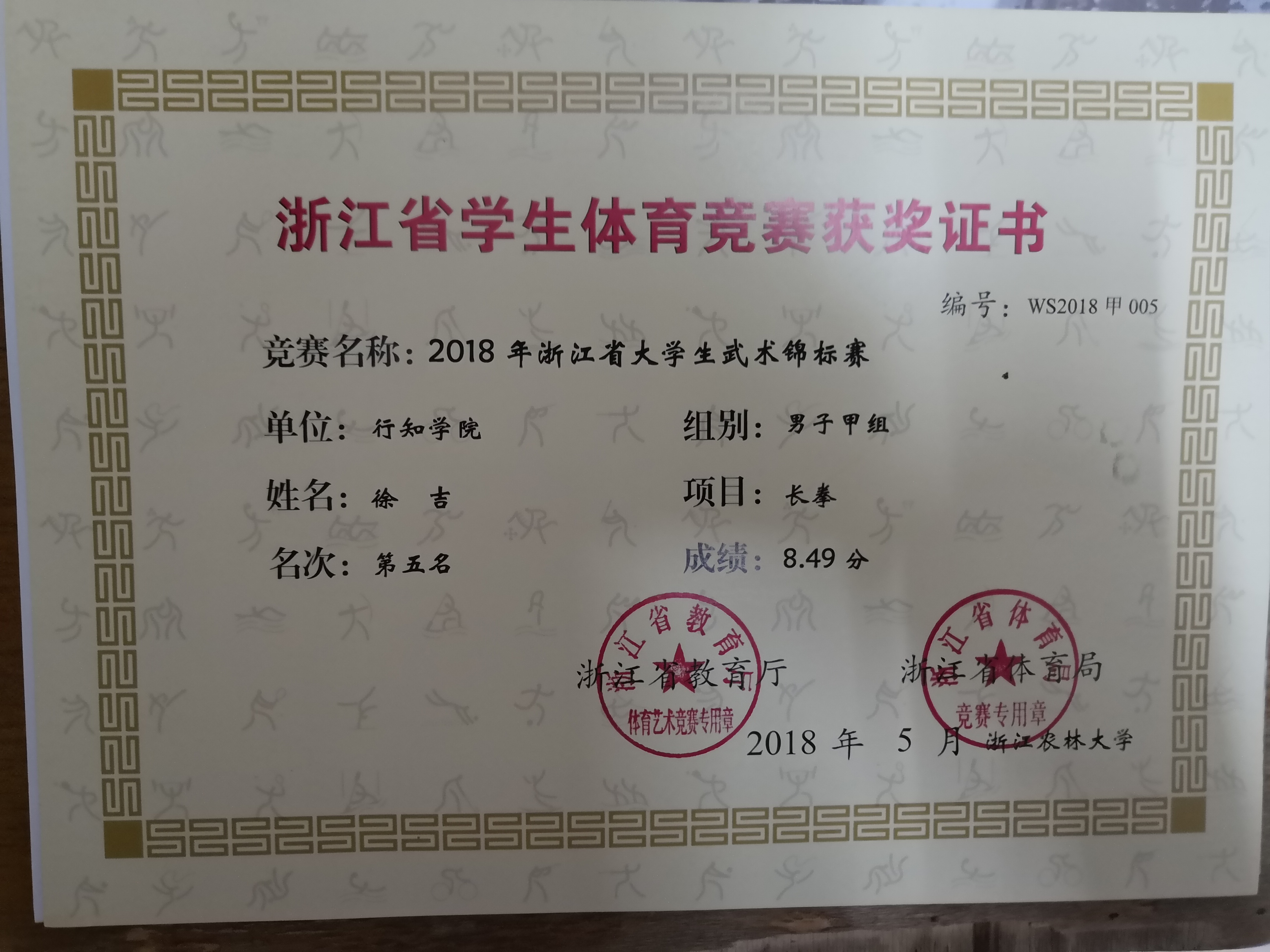5月6日,浙江省大学生武术锦标赛在浙江农林大学落下帷幕,我院徐吉同学参赛,获得男子甲组自选长拳第五名,男子甲组剑术第五名。