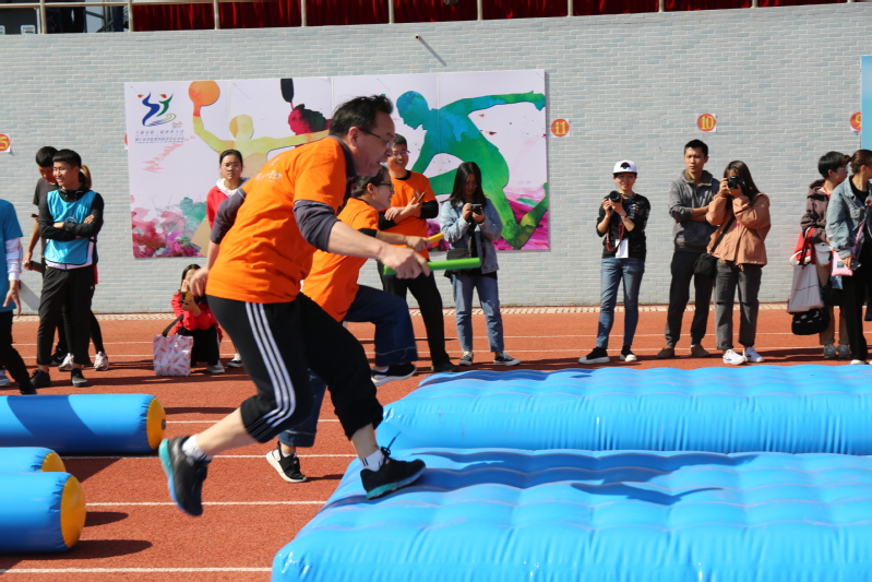 首先进行的是校地奋力争先联谊比赛。该项目包含有跨栏、钻圈、过独木桥和弯腰跑等内容,极具挑战性。参赛队员们一鼓作气,各出奇招,场下欢笑不断,掌声雷动。“跨栏的时候要注意把握节奏”“过独木桥的时候不要太急,要用巧劲。”虽然艰难重重,但阻挡不了队员们坚持到底、拼搏进取的决心。