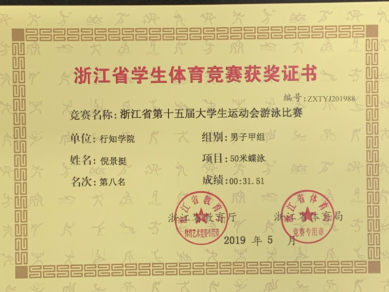 热烈祝贺我院2017级倪景挺同学在浙江省第十五届大学生运动会游泳比赛男子甲组50米蝶泳项目上获第八名。