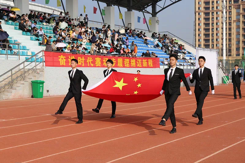 伴随着嘹亮激昂的音乐,国旗队迈着整齐的步伐庄严地走过主席台。他们矫健的步伐迈出时代的旋律,在全院师生的注视下接受检阅。
