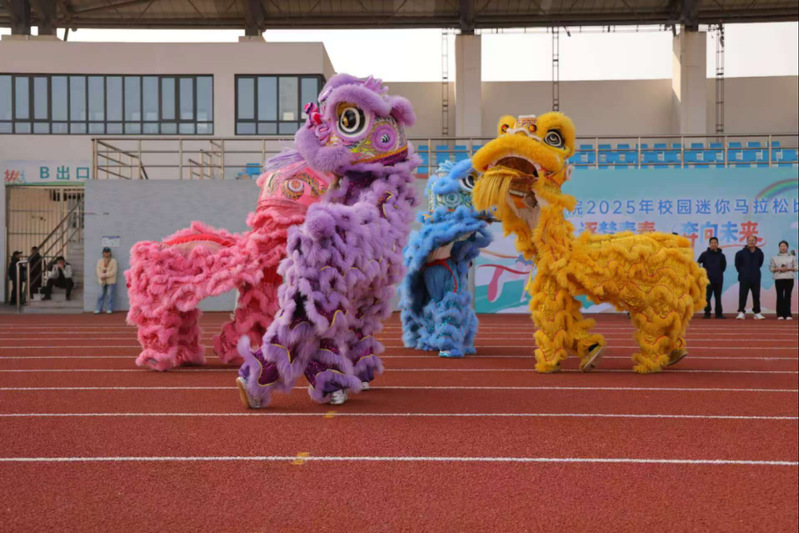鼓声激越,醒狮昂首跃出,一场刚劲昂扬的舞狮表演率先点燃赛场。随后,全体师生齐做热身,活力洋溢,为开跑做好充分准备。